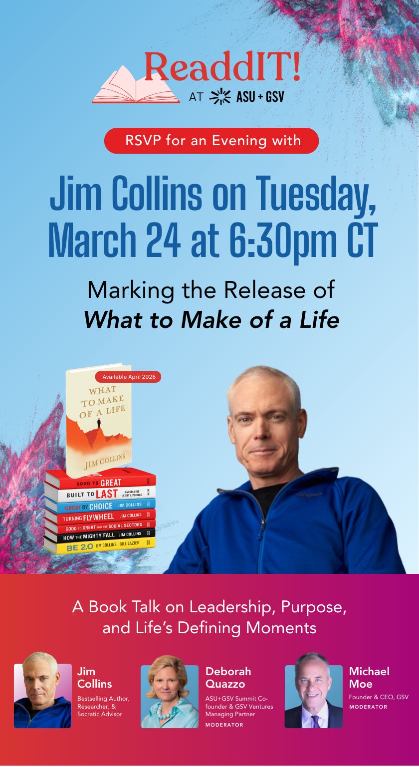 Join me Tuesday, March 24, for a live book talk with Jim Collins— bestselling author of Good to Great and Built to Last and named one of Forbes’ “100 Greatest Living Business Minds”—sharing early reflections on What to Make of a Life, his first book since 2020 and the result of a decade-long research project on how individuals navigate pivotal moments and construct meaningful lives.