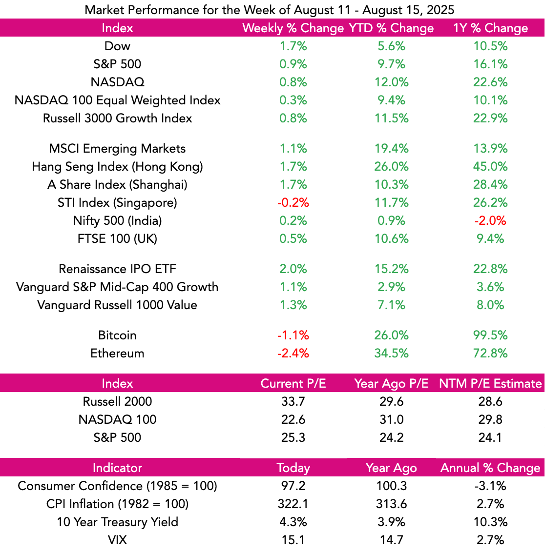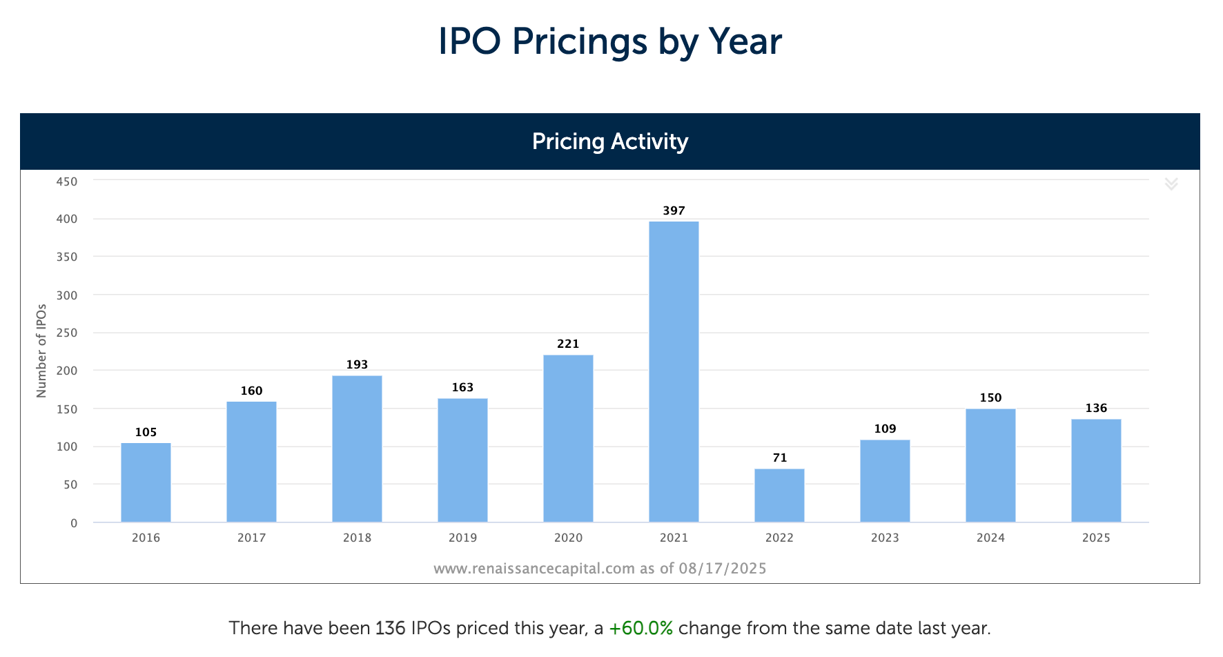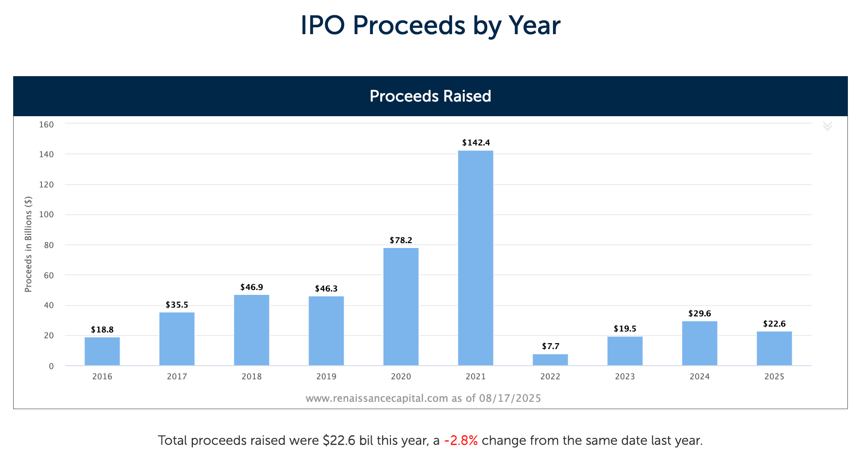 Two hot 2025 IPOs took some air last week with both enjoying strong results but announcing secondary stock sales. CoreWeave, which had gained 150% since IPO, reported revenue growth of 209% but shares fell over 22% on a larger loss than expected and the lockup period expiring. Circle reported revenue growth of 53%, but it shares fell 6% but are still up over 380%.