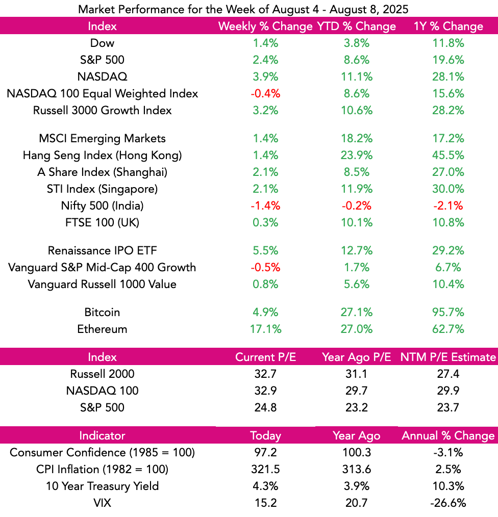 While headline numbers for growth stocks were strong—with leaders such as Palantir rocketing another 20% after reporting the fifth quarter in a row of accelerating results and 48% revenue growth—performance was mixed. Specifically, a number of semiconductor stocks dropped after President Trump said they would be excluded from a 100% tariff if they invested in the United States. Taiwan Semiconductor, which is building a FAB in Arizona, was seen as a big beneficiary of that news, and the stock responded in kind. Astera Labs surged over 36% with massive growth of 150% in revenue and 238% in EPS growth.