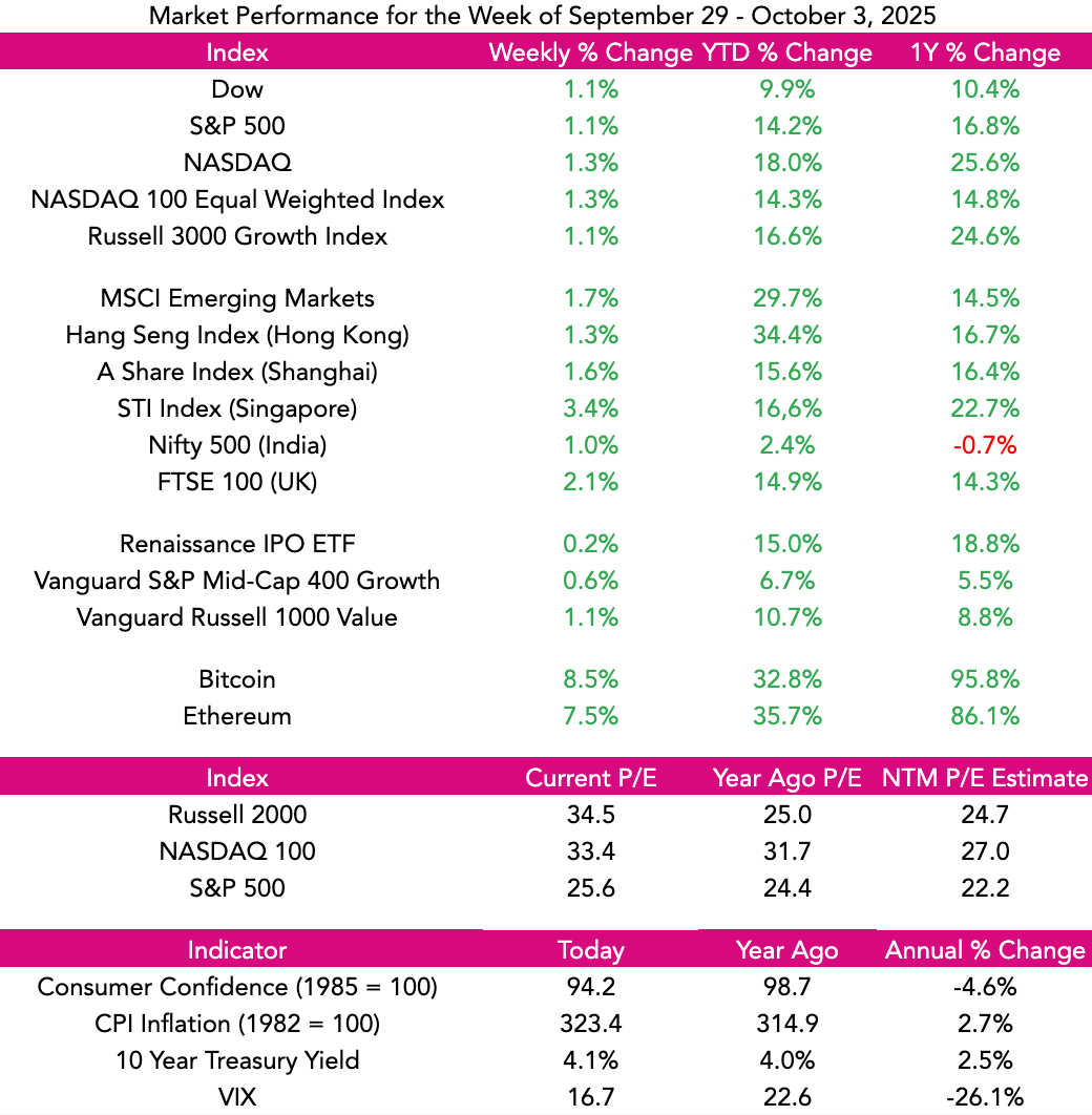 For the week, stocks continued to rock with the Dow and S&P 500 each advancing 1.1% and the NASDAQ rising 1.3%. Year-to-date, NASDAQ is up 18%, the S&P has risen 14.4% and the Dow is nearly 10% higher.